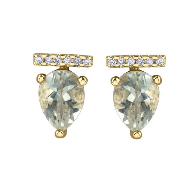10 Karat Yellow Gold Stud Earrings Featuring Two 7x5mm Pear-Shape Green Amethyst, Accented by 12=0.48ctw Round Brilliant Cut Diamonds JKL in Colour, I1 in Clarity.