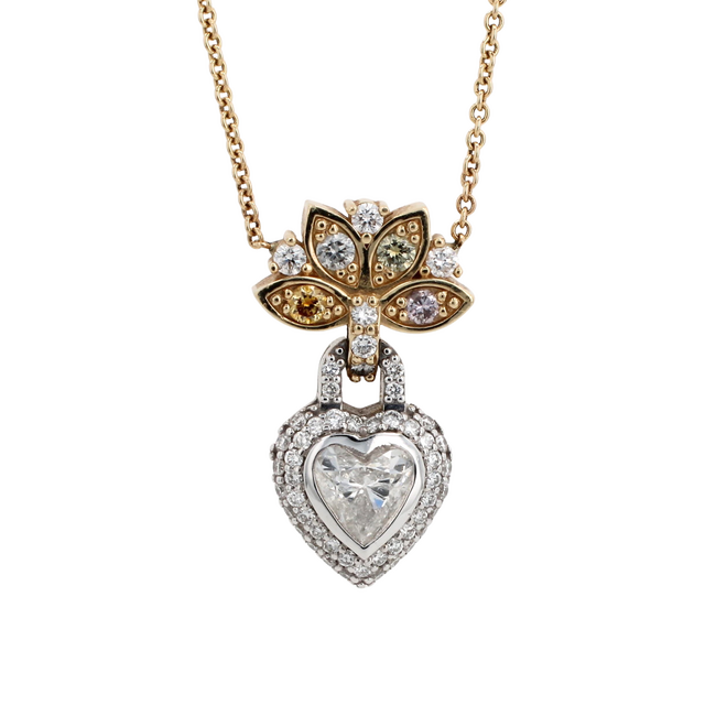 This Custom-Made 14 Karat Two Tone Necklace Features One 1.04ct Heart Shaped Diamond, F in Colour, I1 in Clarity, With 5=0.28ctw Round Diamonds, Multi Colour, VS2-SI1 clarity & 52=0.52ctw Round Diamonds GH in Colour, SI1 in Clarity.