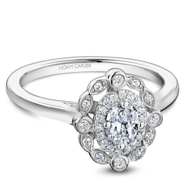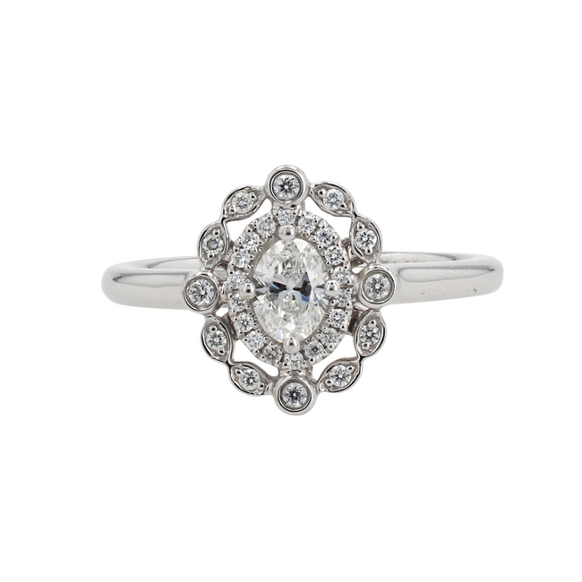 14 Karat White Gold Engagement Ring Set With One Oval 0.33ct Diamond HI in Colour, SI1-2 in Clarity & 30=0.12ctw Round Brilliant Cut Diamonds GH in Colour, SI1-2 in Clarity. Carver Studio Designed in Canada.