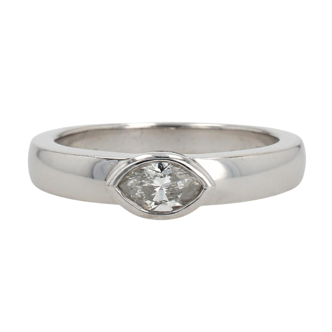 14 Karat White Gold Engagement Ring Featuring One Bezel-Set 0.36ct Marquise Cut Diamond, H in Colour, I2 in Clarity.