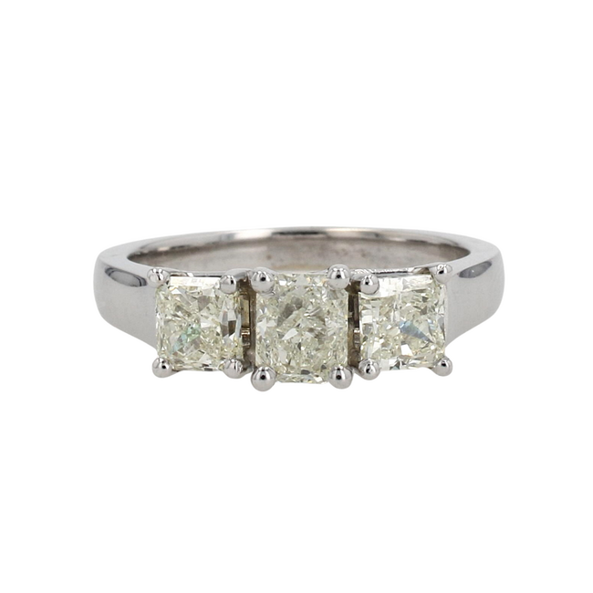 14 Karat Trinity Ring Set With one 0.63ct Radiant Cut Diamond KL in Colour VS2 in Clarity with a Very Good Cut, Accednted by 2=1.06ctw Radiant Cut Diamonds KL in Colour VS1-2 in Clarity.