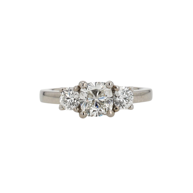 14 Karat Trinity Ring Set With one 0.91ct Cushion Cut Diamond G in Colour SI2 in Clarity With an Excellent Cut Accednted by 2=0.51ctw Round Brilliant Cut Diamonds GH in Colour SI1-2 in Clarity.