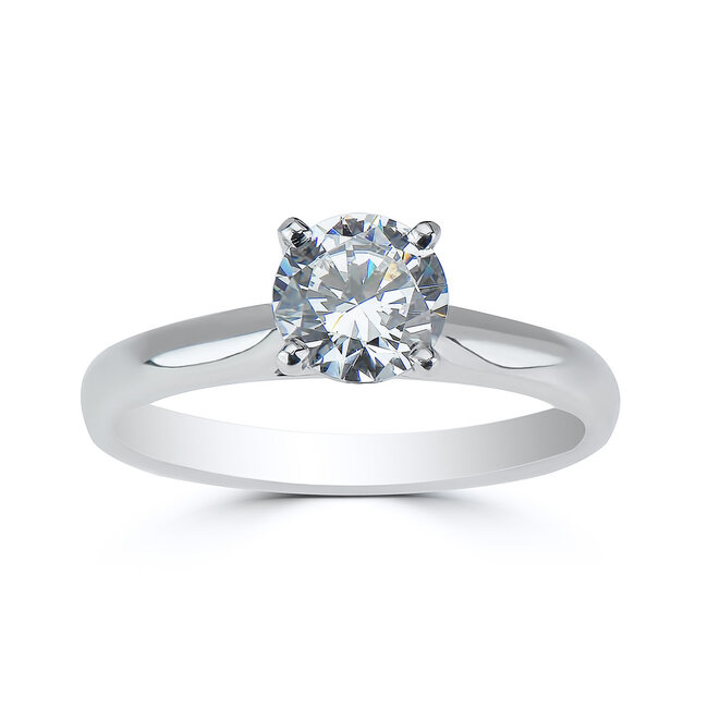 14 Karat White Gold Solitaire Engagement Ring Set With One 1.00ct Round Brilliant Cut Diamond, GH in Colour, I2 in Clarity, G Cut.
