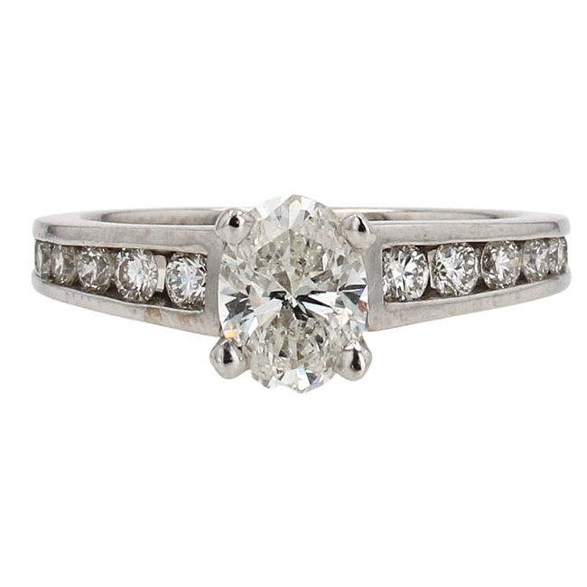 14 Karat White Gold Engagement Ring Set With One 1.01ct Oval Diamond F in Colour SI2 in Clarity with a Very Good Cut Accented By 14=0.49ctw Round Brilliant Cut Diamonds GH in Colour SI1 in Clarity
