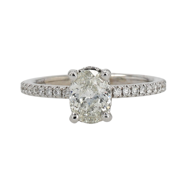 14 Karat White Gold Engagement Ring Set With One 1.01ct Oval Diamond J in Colour SI2 in Clarity Accented By 50=0.28ctw Round Brilliant Cut Diamonds GH in Colour SI1 in Clarity.