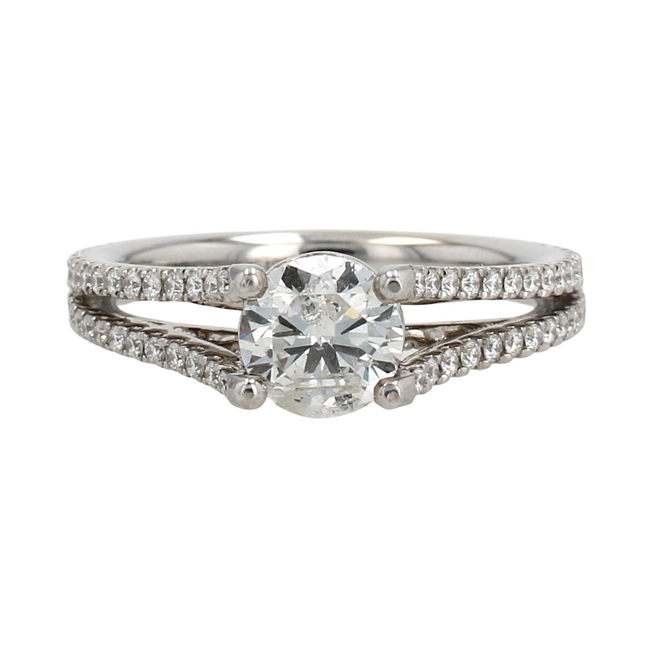 Engagement Ring In 14K White Gold Featuring A 1.02ct Round Brilliant Cut Diamond IJ in Colour I2 in Clarity Accented By 90=0.43ctw Round Brilliant Cut Diamonds GH in Colour SI1-2 in Clarity.