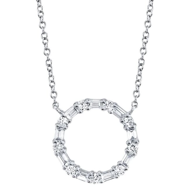 Crafted in luminous 14k white gold, alternating 0.29ctw baguette and round brilliant G-H color, SI clarity diamonds create a radiant open circle that symbolizes unity and everlasting style. Measures 15-18".