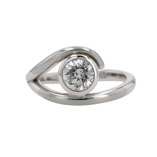 Custom-Designed by Stephen Cole, this 14K White Gold Free Form Engagement Ring Features One 0.85ct Round Brilliant Cut Diamond HI in Colour, I1 in Clarity.