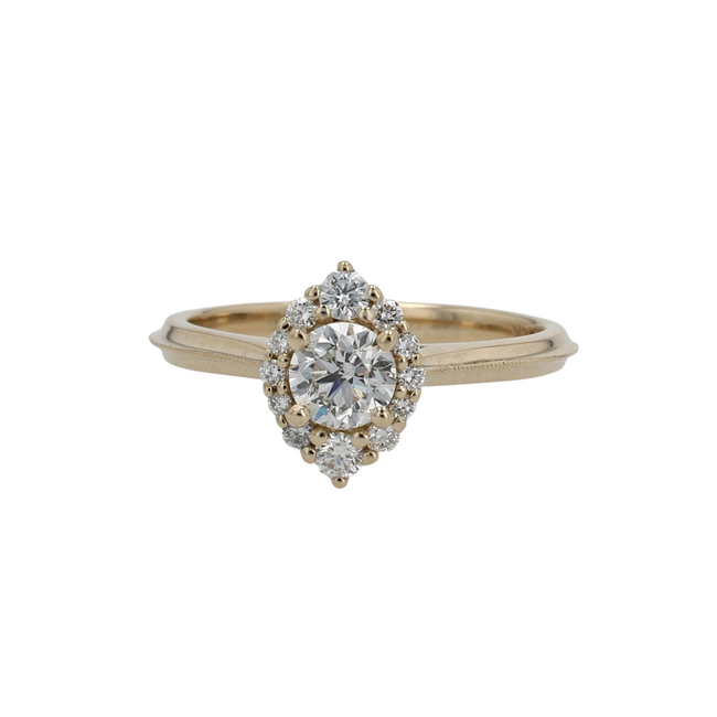 14 Karat Yellow Gold Engagement Ring Featuring One 0.43ct Round Brilliant Cut Diamond, FG in Colour, SI1 in Clarity & 12=0.19ctw Round Brilliant Cut Diamonds GH in Colour SI1-2 in Clarity.
