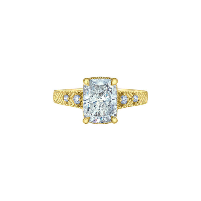 This 14 Karat Yellow Gold Ring Features An Elongated 3.09ct CushionCut Lab Grown Diamond D in Colour VS2 in Clarity Accented By 4=0.10ctw Round Brilliant Cut Lab Grown Diamonds, DF in Colour, VS2 in Clarity.