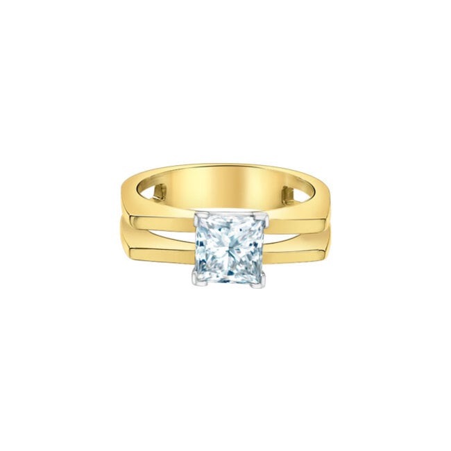 14 Karat Two-Tone Open Solitaire Ring Features One 1.51ct Princess Cut Lab Grown Diamond F in Colour VVS2 in Clarity.