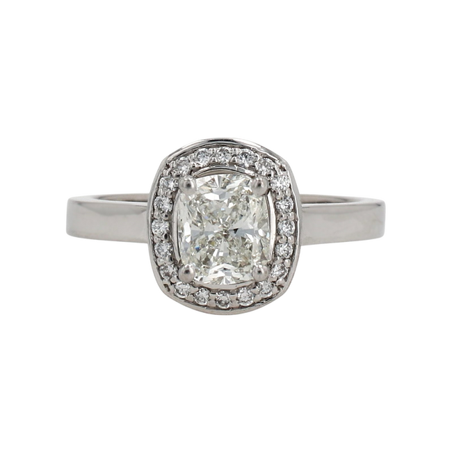 Engagement Ring In 18K White Gold Featuring A 1.00ct Canadian Cushion Cut Diamond H in Colour VS1 in Clarity With A Good Cut, Accented By 18=0.14ctw Round Brilliant Cut Diamonds GH in Colour SI1-2 in Clarity.
