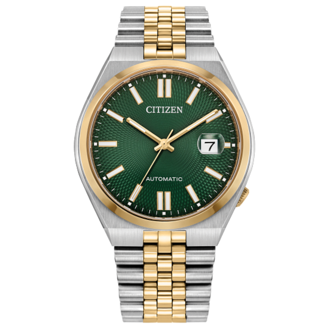 The latest TSUYOSA “60”, brings ultramodern sports styling right to your wrist in a 40mm footprint. Powered by an automatic movement and featuring sunray green dial, with a 3 o’clock date window and gold-tone details.