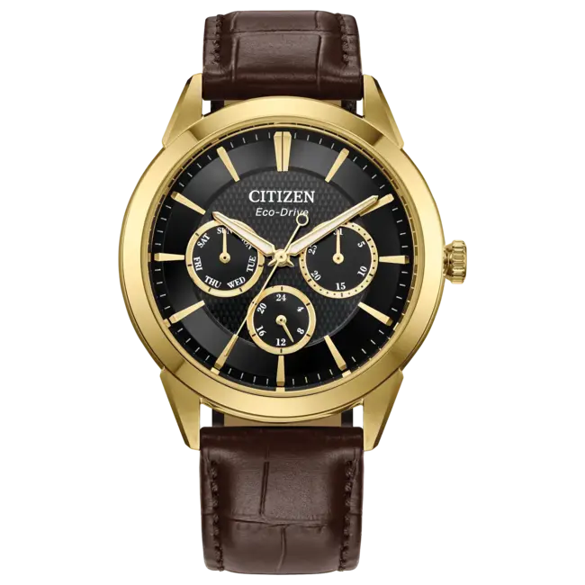 The 40mm gold-tone stainless steel case is the perfect base for the watch's black dial, with three sub-dials upon a textured inner sector adding to its distinct appeal. Applied accents and a brown leather strap round out the look, with features including 12/24-hour time and analog day/date indicators to balance the chic aesthetics with the functionality of this sophisticated timepiece. Sustainably powered by any light with our proprietary Eco-Drive technology and never needs a battery. Water resistant up to 100m. Calibre 8729.
