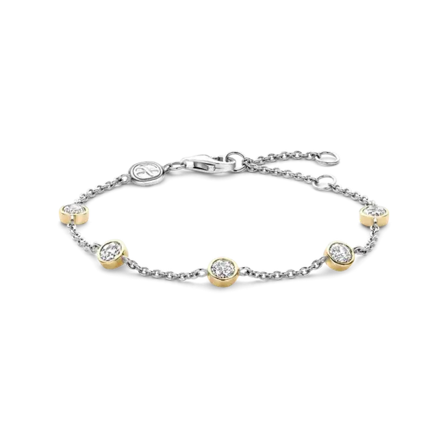 Crafted from premium 925 sterling silver and finished with a radiant yellow gold plating, this delicate chain bracelet features five bezel-set white cubic zirconia stones.