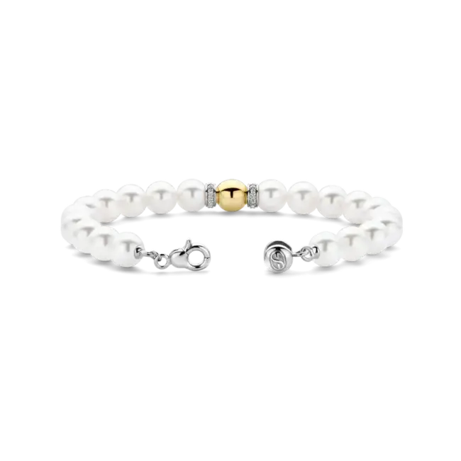 Polished 925 sterling silver links are plated in radiant yellow gold and punctuated by 8 mm cabochon-set white pearls whose natural lustre catches the light. Measures 7.5"
