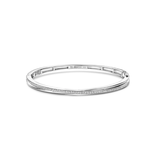This Ti Sento Bangle Bracelet features two intertwined bands. One band is adorned with a dazzling pave of white cubic zirconia stones, creating a shimmering effect. The other band is smooth and sleek, providing a striking contrast.