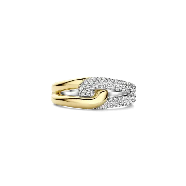 Sculptural elegance with this TI SENTO ring intertwines two distinct bands into one flowing silhouette: a polished yellow-gold plated arc wraps around two pavé-set platinum-plated rows, each adorned with brilliant-cut white cubic zirconia. Size 7.
