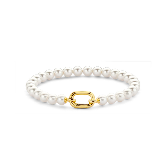 This bracelet features a stream of small luminous pearls, each carefully selected to exude a sense of refined sophistication. At its heart lies a yellow gold-plated signature link lock, designed to keep this piece with you all the time. Measures 7.5"